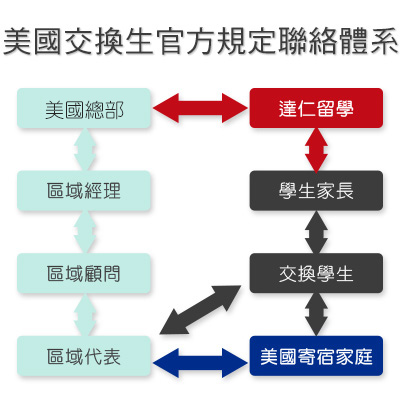 答:根據美國交換生官方承辦機構的要求,交換生在美國期間,不得與父母親過度聯繫,以免造成學生過多的心理依賴,並且因語言及文化差異,轉述之間容易引發誤會,引起志願家庭的困擾及不愉快,更違背交換生計畫的宗旨(請參考Q11)。於此美國承辦機構有「五位一體」的管理流程:亦即總部、達仁留學、區經理、區顧問、區代表五個管理單位,每個管理單位各司其職,依據您的身分有不同的溝通單位(參考下圖),切忌擅自更改溝通單位,無論當下或未來均會對學生造成不良的影響。